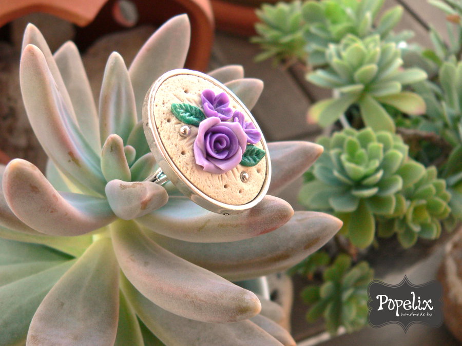 Ρομαντικό δαχτυλίδι από πολυμερικό πηλό σε οβάλ καστόνι με χειροποίητα μοβ λουλούδια. Το δαχτυλίδι προσαρμόζεται στα δάχτυλά σας.