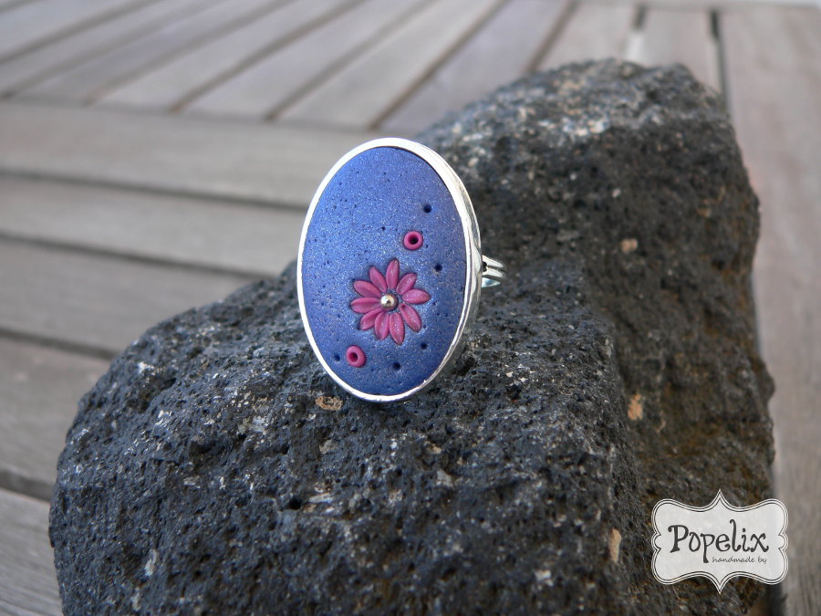 Ρομαντικό δαχτυλίδι από πολυμερικό πηλό σε οβάλ μεταλλικό καστόνι. Μπλε ρουά φόντο και ροζ απλικέ μαργαρίτα. Το δαχτυλίδι προσαρμόζεται στα δάχτυλά σας.