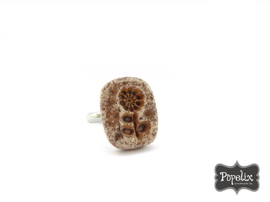 Ιδιαίτερο δαχτυλίδι από πολυμερικό πηλό με σταμπωτό σχέδιο λουλούδι με φύλλα. Μπεζ, καφέ και χρυσό χρώμα. Το δαχτυλίδι προσαρμόζεται στα δάχτυλά σας.