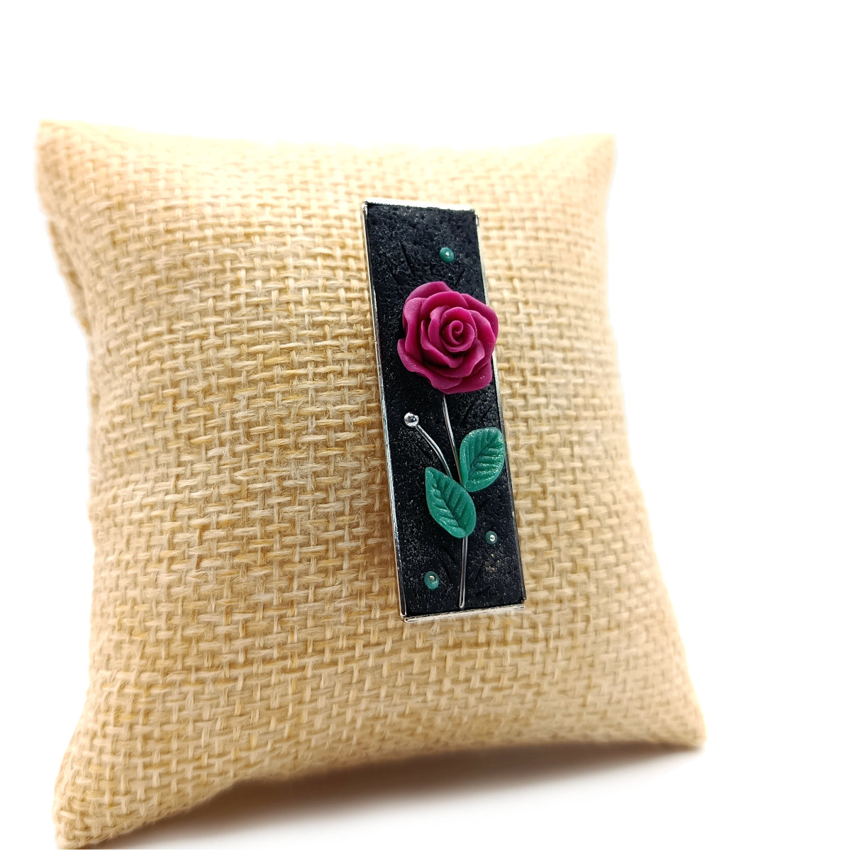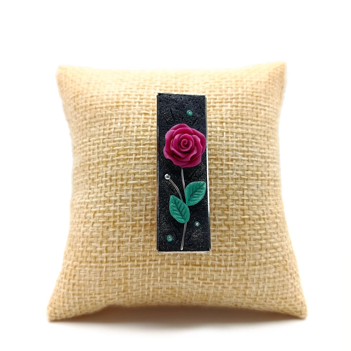 Ρομαντική καρφίτσα από πολυμερικό πηλό σε ορθογώνιο μεταλλικό καστόνι, 4,5 εκ. Λουλούδι με μίσχο, 100% πλασμένο στο χέρι σε μπορντό απόχρωση σε μαύρο μεταλλικό φόντο.
