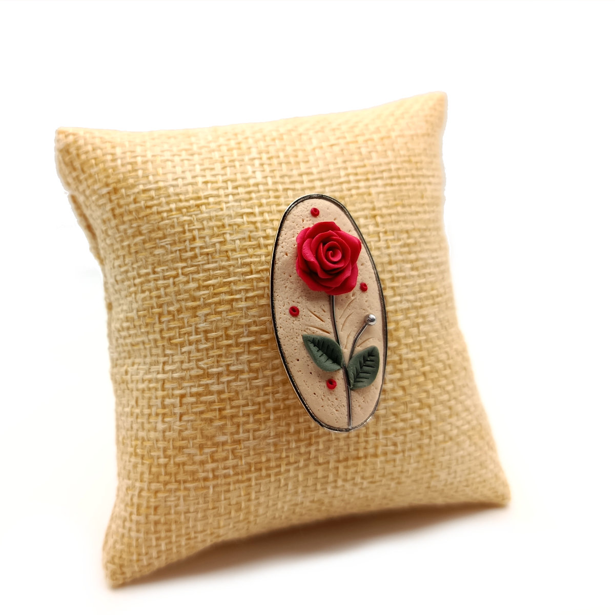 Ρομαντική καρφίτσα από πολυμερικό πηλό σε οβάλ μεταλλικό καστόνι με μήκος 3,5 εκ. Λουλούδι 100% πλασμένο στο χέρι, κόκκινο τριαντάφυλλο σε μπεζ φόντο.