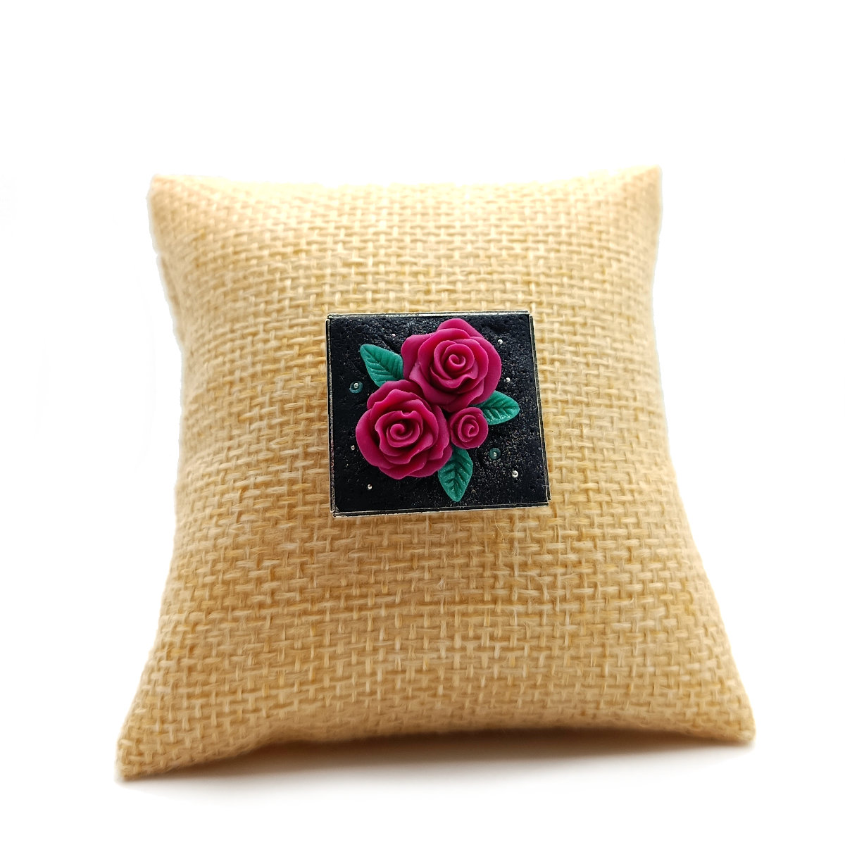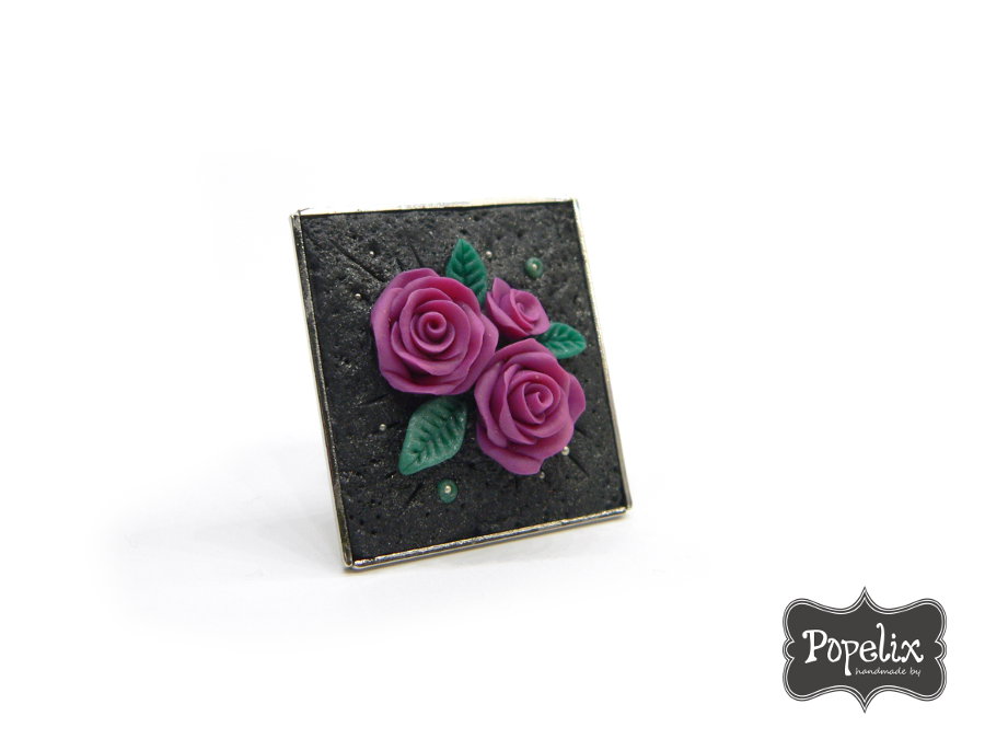 Καρφίτσα με σχέδιο από πολυμερικό πηλό σε τετράγωνο μεταλλικό καστόνι 2,5 x 2,7 εκ. Μαύρο μεταλλικό φόντο και μπουκέτο από χειροποίητα λουλούδια και διάφορες λεπτομέρειες.