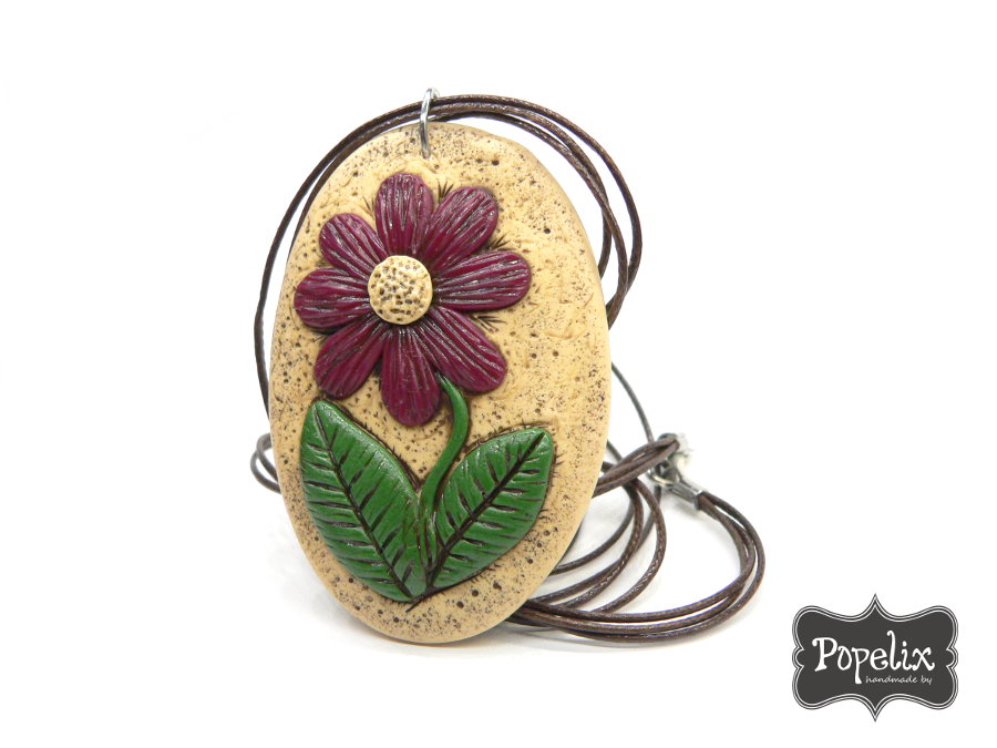 Ιδιαίτερο μενταγιόν με ανάγλυφο σχέδιο σε πολυμερικό πηλό. Δεμένο με τριπλό καφέ συνθετικό κορδόνι.