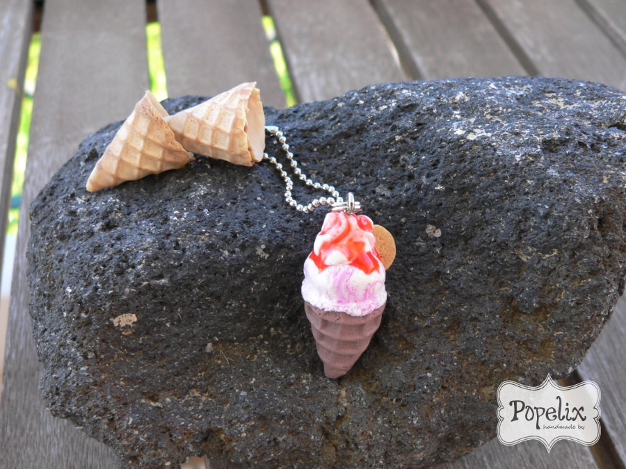 Μινιατούρα παγωτό χωνάκι από πολυμερικό πηλό. Μπισκοτένιο χωνάκι, παγωτό βανίλια φράουλα, σαντιγί, μπισκοτάκι και σιρόπι, όλα χειροποίητα από πηλό. Φοριέται με αλυσίδα μπίλια ή συνθετικό κορδόνι σε καφέ χρώμα.