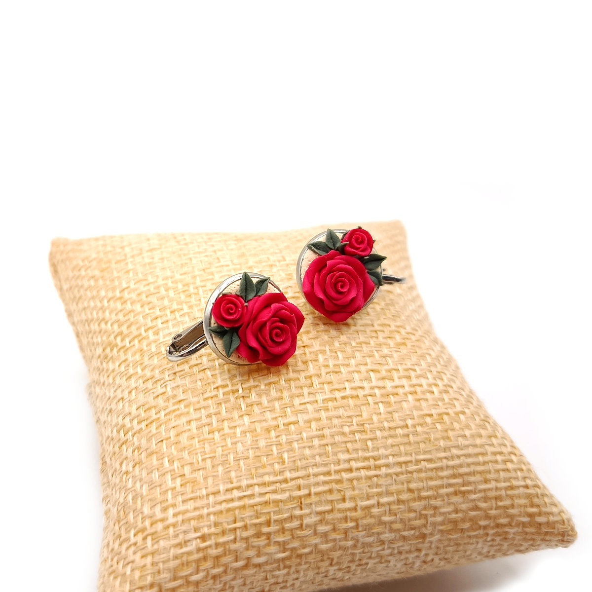 Ρομαντικά σκουλαρίκια κλιπς από πολυμερικό πηλό σε ατσάλινο καστόνι. Χειροποίητα λουλούδια χωρίς καλούπι σε μπεζ φόντο. Διάμετρος 1,4 εκ., με κουμπώματα κλιπς. Μπορούν να γίνουν και καρφωτά, κατόπιν παραγγελίας.